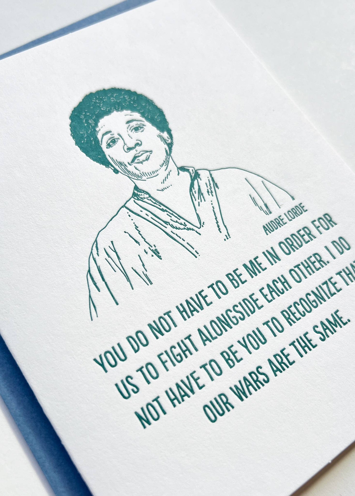 Audre Lorde: poet, intersectional feminist, writer, professor • blank inside and measures 4.25”x5.5” folded • card is letterpress printed in teal blue ink on 100% cotton paper • accompanied by an A2 blue envelope • packaged in clear cello sleeve