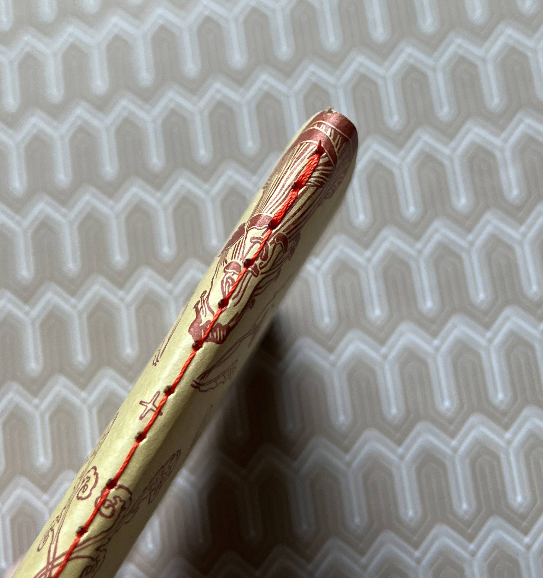 • sewn stitched binding on the left in coordinating thread
